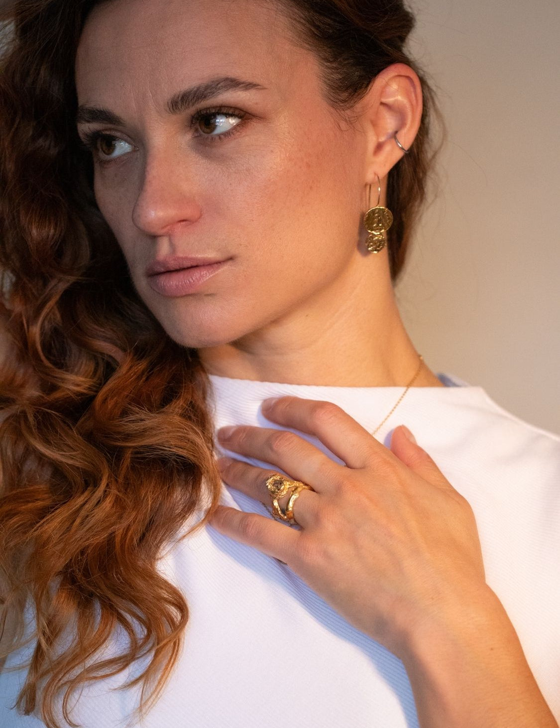 She adorns her temple in protective pieces and ancient feminine symbols, choosing these icons as powerful anchors for her eternal, divine connection.