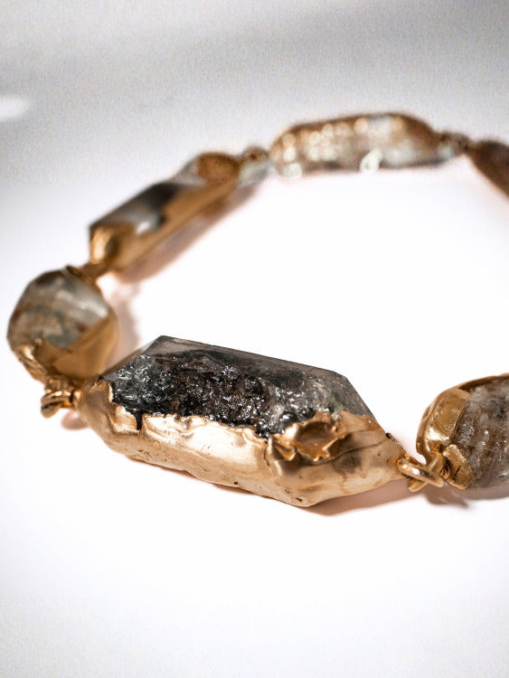 She adorns in raw untamed textures and ancient symbolism, using the jewelry as a commanding talisman for your non-negotiable presence.